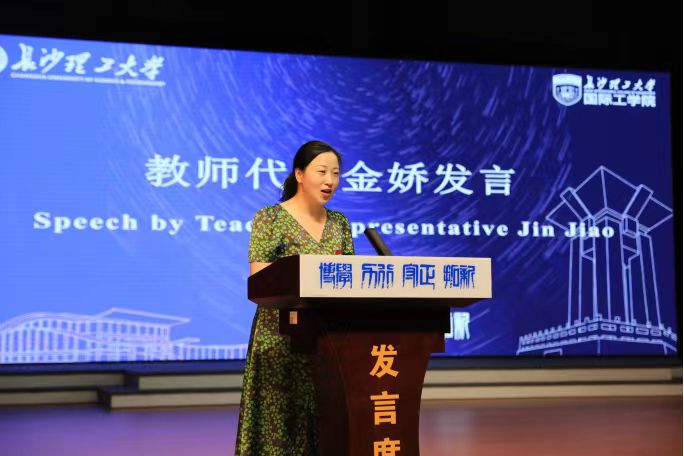 教师代表学校2024年度青年教学优秀奖获得者金娇发言,她强调同学们在大学中应拥有三样东西:兴趣,理想,目标。指引新生们找准自己的人生定位,在接下来的大学生活中青云直上。
