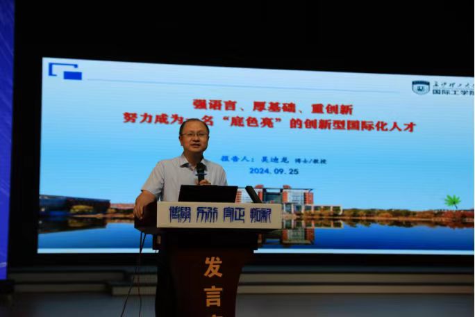 最后,院长吴迪龙主讲开学第一课。他以“强语言、厚基础、重创新,努力成为一名‘底色亮’的创新型国际化人才”为主题展开讲解。从学院概况,发展前景,人才优势等方面作出详细介绍,层层推进,引导着新生们找到自己的专业优势,勇于追逐自己的梦想。他勉励同学们保持对自我、对专业、对学院、对国家社会的自信,便是对“博学,力行,守正,拓新”的长理校训最大程度的践行。