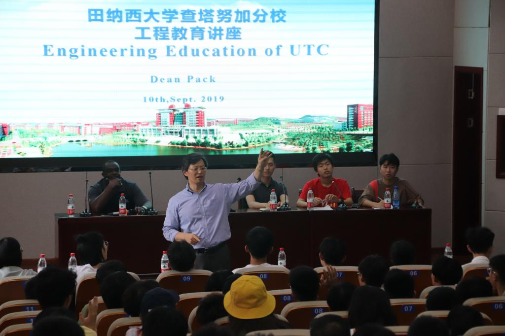 为提高中外办学项目学生对国际土木工程的专业认知,加深对美方外方合作院校田纳西大学查塔努加分校的了解,9月10日下午3点,国际学院特邀请该校工程与计算机科学学院院长Daniel J.Pack 教授、土木工程系系主任Joseph Owino教授,在工科二号楼B301为项目2017和2018级学生作国际土木工程教育专题讲座。国际学院副院长秦卫星、中外合作办学项目教务办全体老师、年级辅导员以及160余名同学参加,讲座由秦卫星主持。