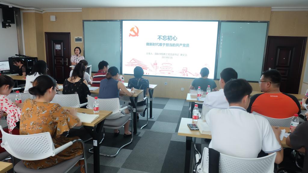 教工党支部书记黄文卫以“不忘初心,做新时代敢于担当的共产党员”为题上党课。首先她从个人成长背景出发分享了她的入党初心。接下来,她介绍了新时代高校党支部建设面临的形势,提出师生党员需要具有担当精神,并结合个人工作体会和学院发展实际,剖析师生党员如何在工作和学习实践中勇于负责、敢于担当。