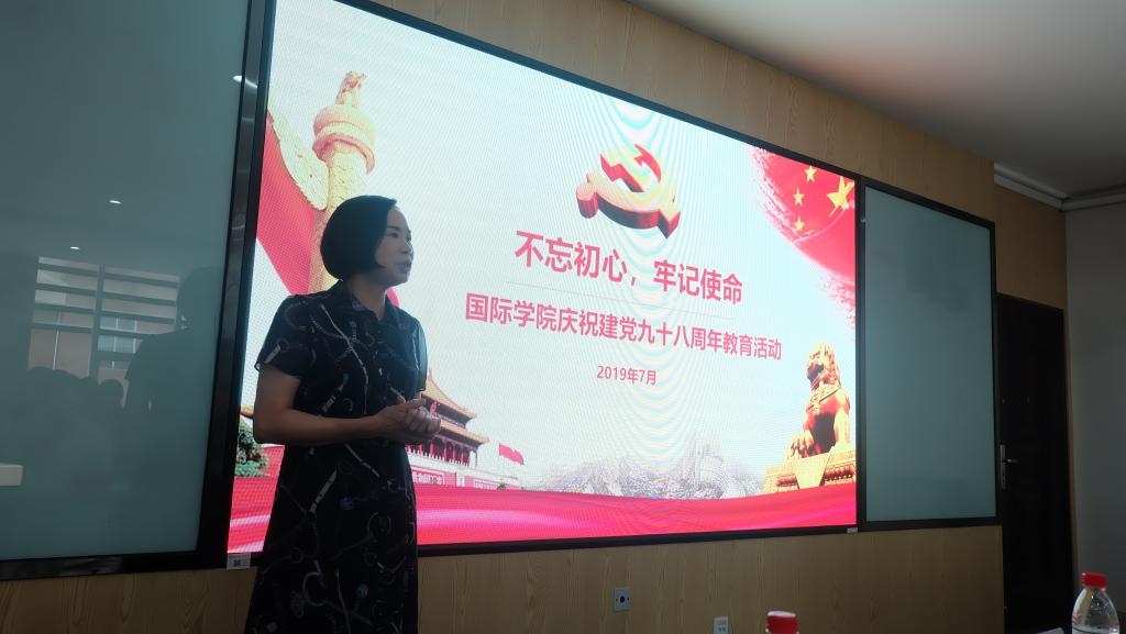 7月3日下午,国际学院举办庆祝建党98周年暨“不忘初心、牢记使命”主题教育,学院党政领导、全体师生党员、第33期入党积极分子和发展对象齐聚一堂。此次活动由先进表彰、党员入党初心分享、支部书记上党课、重温入党誓词、榜样学习五个环节组成,是学院活党氛,兴党业,抓党建的一次重要活动。