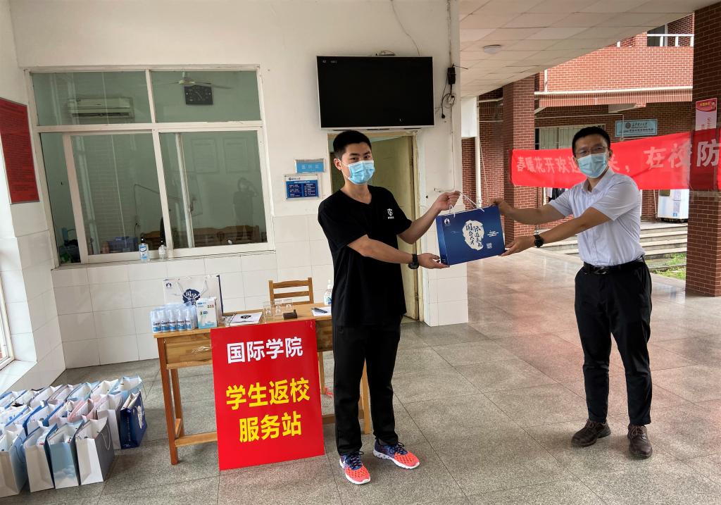 除了消毒液、洗手液、口罩等防疫物资,还有特地为毕业生准备的国风学习册、U盘、平板支架等纪念品——这是伟德betvlctor1946源于英国国际学院为2020届毕业生准备的“奋斗青春”纪念包。在本学期返校的第一天,学院领导、老师就把纪念包送到了最早返校的毕业生手中。