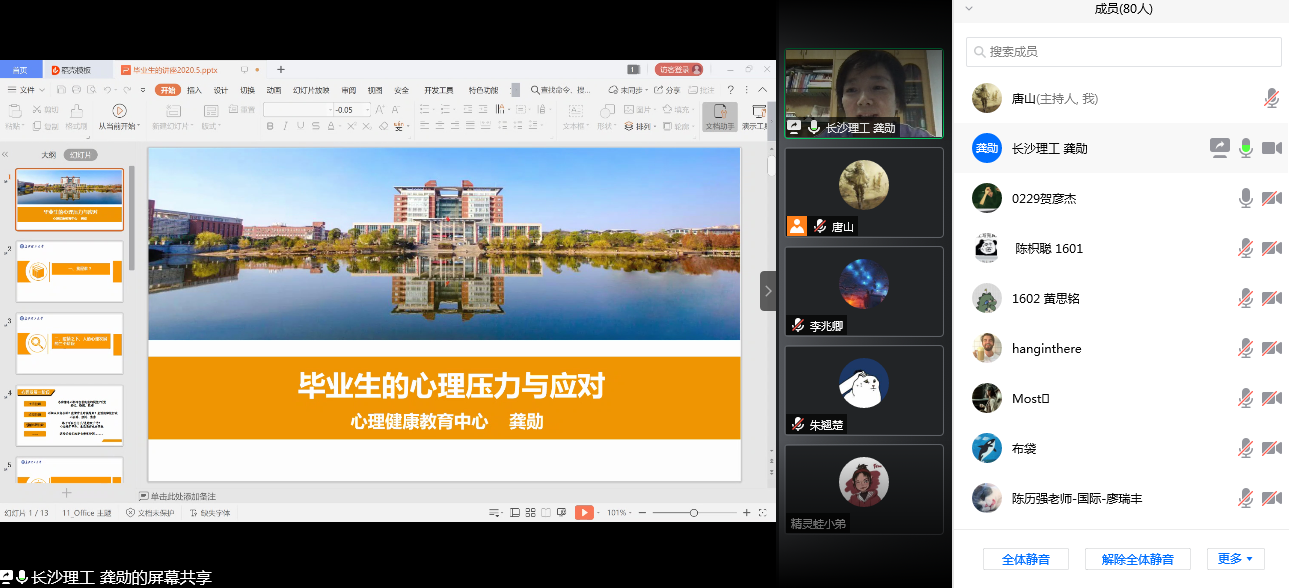 龚勋主任分析了毕业生所面临的心理压力,并指导学生应当采用的应对方案。首先,龚勋主任分析了此次疫情可能会给我们带来的影响,并指出了疫情之下,人们心理发展的三个阶段。在此基础上,龚勋主任继续分析了后疫情阶段,毕业生的心理状况,并提出了解决方案。其次,对于毕业年级学生所面临的各种客观问题与压力:例如,就业、考研等,大家应该改变态度、学会求助,与同学和老师一起分析自身压力。随后,对于那些难以解决的问题与压力,同学们可以找专业人士进行开通疏导,并留下了“湖南省高校疫情心理援助平台”以及“伟德betvlctor1946源于英国线上心理服务平台”的联系方式,给有需要的学生提供帮助。最后,龚勋主任指出,面对生活中的各种变化,我们一定要积极地调整自己的心态,聚焦于当下我们能够做到的事,对自己不要有过度的要求,这样我们才能够调整好自己的心理与情绪,平稳度过这个特殊的毕业季。