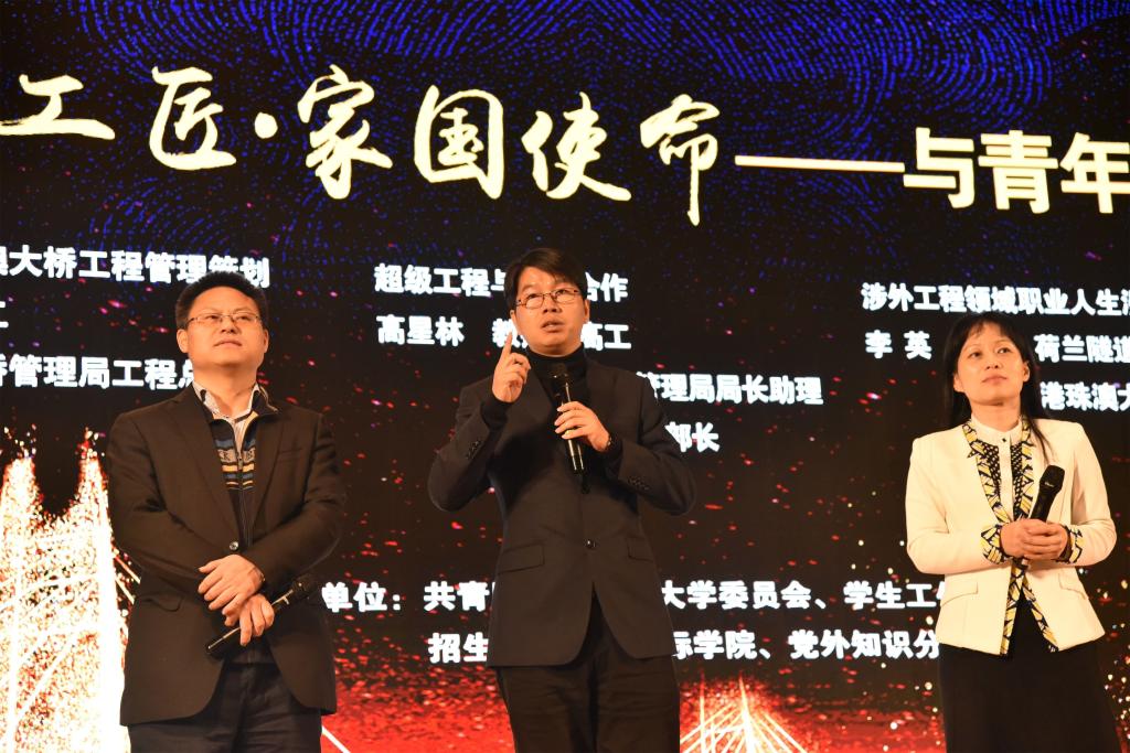 一桥飞架三地,天堑变通途,当港珠澳大桥宏伟的身段,频频闪现在伟德betvlctor1946源于英国云塘校区大会堂的屏幕上时,伴随着的是长理师生阵阵欢呼……4月3日晚7点,国际学院、共青团伟德betvlctor1946源于英国委员会、学生工作部(处)、招生就业处、党外知识分子联谊会等共同举办的“大国工匠·家国使命”——港珠澳大桥建设者与长理青年学子面对面活动成功举行,伟德92级校友港珠澳大桥工程总监张劲文教授级高工以及港珠澳大桥管理局局长助理高星林教授级高工、荷兰隧道公司(TEC)中国首席代表李英博士作为主讲嘉宾莅临活动现场,伟德betvlctor1946源于英国副校长蒋昌波教授、副校长刘扬教授、校党委委员兼国际学院党总支书记付嫦娥教授、相关职能部门和学院负责人、校党外知识分子联谊会理事、国际学院全体师生以及其他学院学生共计1500余人聆听了讲座。