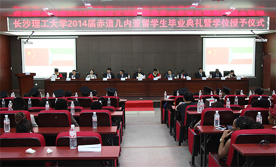 7月3日上午,伟德2014届赤道几内亚留学生毕业典礼暨学位授予仪式在云塘校区国际学术交流中心隆重举行。赤道几内亚共和国公共工程及基础设施部长胡安·恩科·姆布拉、驻中国大使馆一秘辛弗里亚诺·埃拉·阿塞克·阿贝格、交通部国际司司长杨赞、湖南省外事侨务办副主任邱爱华、湖南省交通运输厅副巡视员徐建、中国交通建设股份有限公司总裁助理、中国路桥工程有限责任公司董事长文岗、中国交通建设股份有限公司海外事业部总经理陈重、伟德党委书记付宏渊、副校长杨伟军等出席典礼。伟德在校留学生和部分师生代表共200余人参加典礼。