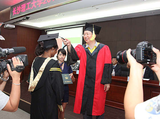 11名身穿学位服的赤道几内亚毕业班留学生依次上台,付宏渊为每一名毕业生颁发学位证书并拨穗。