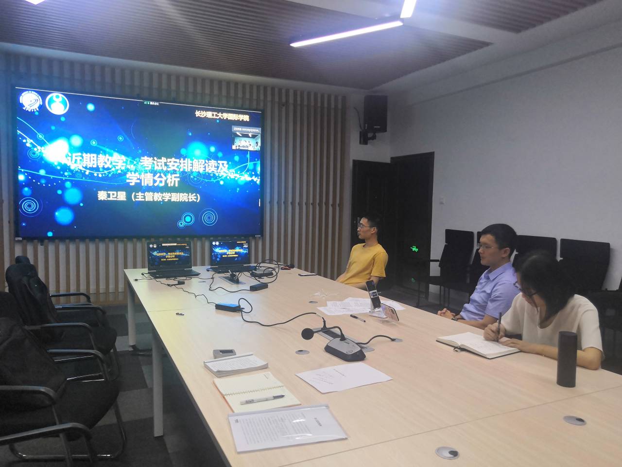 首先,张锐对2019级的学风建设情况做出分析,通报了学院的考研、就业情况,张锐再次强调了疫情防控的注意事项,并对全体2019级学生开展安全教育、心理健康教育,告诫全体学生不要下河下水库等危险地带游泳。随后,秦卫星就近期教学,考试安排进行了详细解读,并对2019级学生入学以来的学习情况做出了具体分析。随后,陈瑜院长总结讲话,对全体学生提出了几点要求,要求学生们坚定信心、积极进步;服务大局,抗疫不松懈;高度自律,以学业为重;重任在肩,勇于追梦。