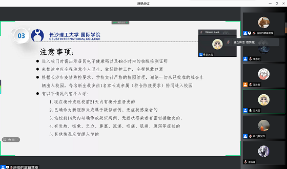 首先唐俊从学院师资、人才培养、日常管理等多个方面详细的介绍了学院概况,并向21级新生介绍了国际学院的主要领导和辅导员,让新生能更加方便向老师们咨询。随后易芙蓉为新生介绍了入学安排及注意事项,同时积极鼓励同学们入学后要志存高远、瞄准目标,严格要求自己,充实地过好每一天。然后唐俊,张家明,郑生辉,薛润泽,李柏廷等人分别从党团关系转接,日常生活权益以及专业认知三个方面为新生进行讲述,将中外合作办学的外方院校以及教学模式分享给大家。最后新生进行交流答疑,学长们用日积月累的经验去帮助新同学们那初生牛犊的闯劲,用渐趋渐广的眼界去帮助新同学们遨游知识海洋,让大家能够更加快速地融入大学生活,乘风破浪,一往直前。