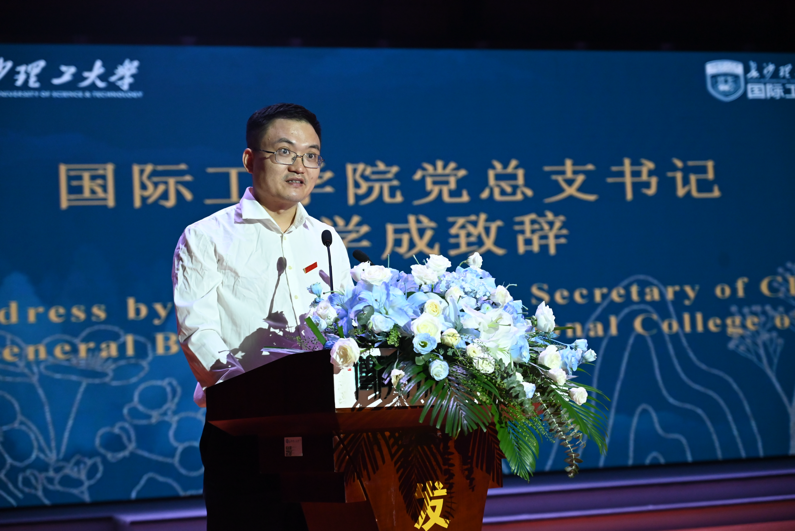 开学典礼在庄严的国歌声中拉开序幕。首先,国际工学院党总支书记王学成致辞,他对新生表示热烈的欢迎与祝贺,鼓励同学们在新的人生阶段奋勇争先、拓宽视野,厚植爱国情怀,争做心怀理想、向美而行的追梦人。