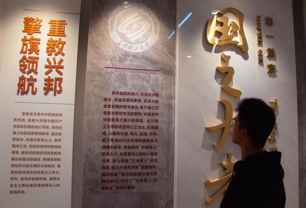 紧接着,大家穿越校园时光隧道,走过“国之大者”、“材之茂者”、“师之贤者”、“行之实者”四大篇章,认真倾听讲解员的解说,了解学校历史,师资力量及其发展前景等。新生代表王丽静激动地说道:看到各项科研成果与教学成就在墙上熠熠生辉,我觉得无比骄傲,相信接下来的大学时光在自己的努力奋斗和老师的指导栽培下,我也能探索更多科研学术领域,不断突破成长。