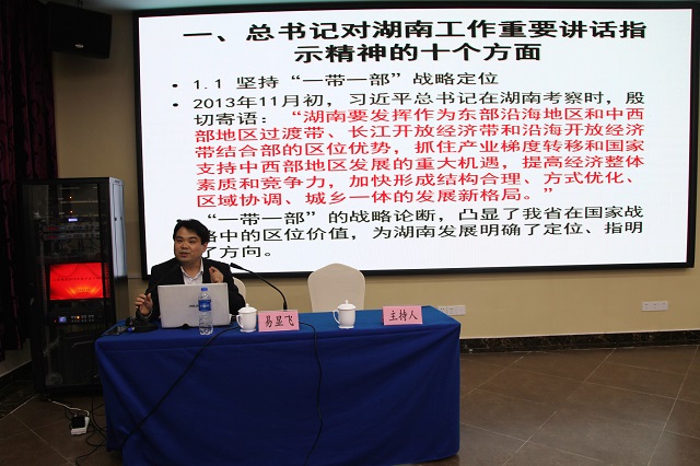 易显飞从习近平总书记对湖南工作重要讲话指示精神的主要内容、主要特质以及努力践行指示精神三方面进行解读。结合后勤集团的工作实际,易显飞就怎样努力践行指示精神提出了宝贵意见:一是结合具体实际,把党中央的战略部署转化为集团、每个人的工作任务,要根据当下任务,以脚踏实地的精神,全面抓好落实总书记关于湖南工作的讲话精神;二是坚持开门办学,做到“引进来”与“走出去”相结合,加强与兄弟院校、科研院所和骨干企业的交流合作,实现优势互补、强强联合,在新时代新起点上,为湖南加快推进科教强省建设贡献应有的智慧。