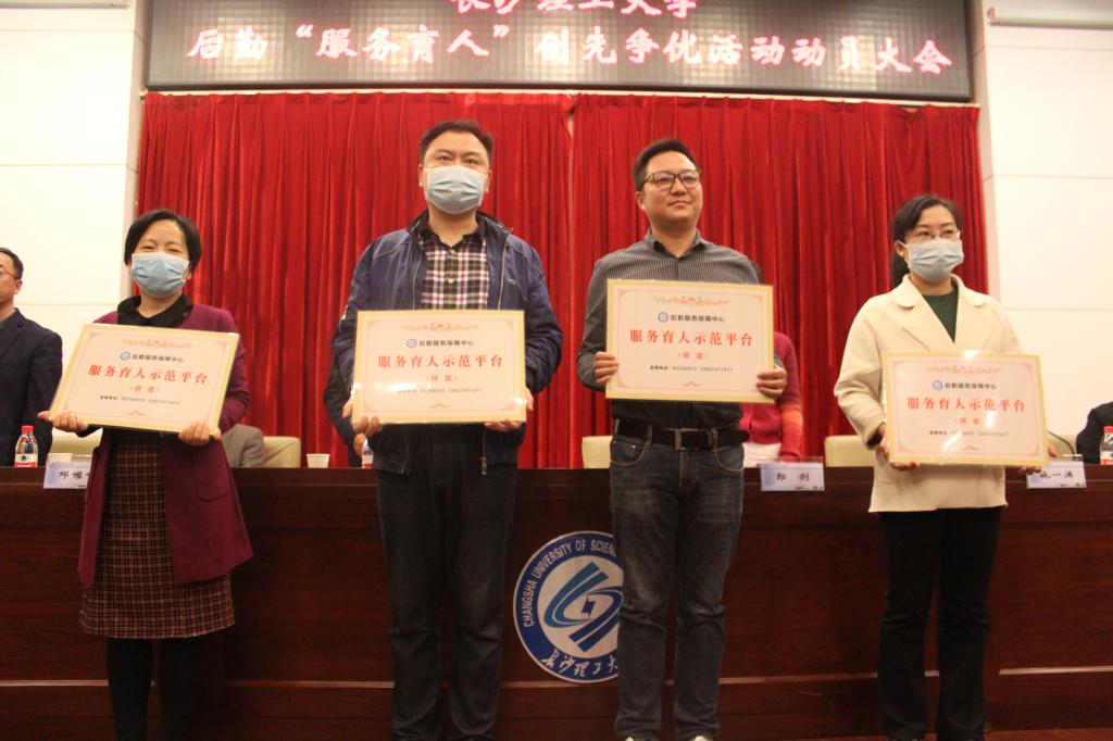 郭剑宣读了服务育人文化建设示范单位、服务育人示范窗口、服务育人示范平台、服务育人党员先锋岗、服务育人标兵岗等五个创先争优创建项目立项通知书。后勤中心副主任、分工会主席柳翼宣读了题为《立足岗位比奉献,服务师生做表率》创先争优活动倡议书。集体示范项目创建负责人代表、餐饮服务部主任李波和个人示范项目创建代表、云塘物业服务部值班员严咏群分别作了表态发言。与会领导为创先争优创建项目的集体和个人授牌并合影留念。
