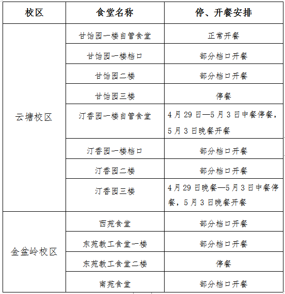 根据学校劳动节放假安排,现将假期各食堂营业时间通知如下: