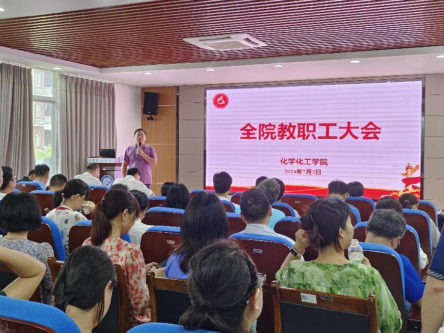 2024年7月2日下午,化学化工学院在新能源大楼3B-301会议室举行全院教职工大会,学院领导班子及全体教职工参加会议。会议由党委副书记、副院长任艮丰主持。