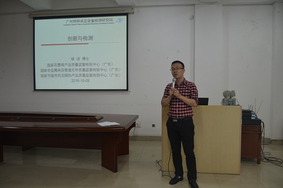 杨波校友介绍了广州特种承压设备检测研究院的人力资源配置的现状、任务与工作范畴,其在质检中的开拓与创新,就“质检为什么要创新、质检如何创新”作了阐述,并展望未来的检测中心的研究创新方向,如石墨烯材料质量监督检测项目。最后要他希望人才合作培养、如实习、实训,研发等多与母校合作交流。