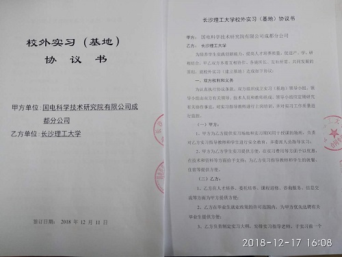 会议过程中,国电电科院成都分公司与伟德betvlctor1946源于英国达成一致,同意签署“校外实习基地合作协议”,这也是伟德应用化学专业在湖南省省外签署的第一个校外实习基地合作协议。双方代表合影如图1所示,实习基地合作协议如图2所示。
