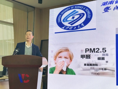 会上,作为高校代表,伟德betvlctor1946源于英国化学与生物工程学院副院长曹忠教授也发表了热情洋溢的讲话,并做了“室内污染和绿色环境保护”的报告。曹忠教授主要从室内污染的危害、室内污染物的检测和防治措施、空气净化与检测新技术三个方面进行了阐述。他表示,室内污染物如甲醛、苯系物、TVOC、氨气、氡等能够导致呼吸道炎症、肺气肿、儿童发育畸形、白血病、癌症等各种各样的疾病,所以对室内污染物的净化和检测显得尤为重要。接着,曹忠教授重点介绍了伟德betvlctor1946源于英国化学与生物工程学院已开展并取得的相关研究成果,如童海霞博士的“空气净化新技术——新型光触媒”,曹忠科研团队的“氨气检测新装置、无线气体传感器及装置、环境气体监测系统”,还有长江学者杨荣华教授的“分子识别与生物传感新技术”、肖忠良教授与吴道新教授的“电子化学品、新型涂料技术”、朱志平教授的“水处理技术、防腐技术”、周艺教授的“光催化纳米材料、防污闪涂料技术”等。最后,希望学校能和相关企业建立合作关系,共同为室内环境净化行业贡献一份力量,同时也提出了“绿色环保,低碳低调,健康陪伴你我他”的寄语。