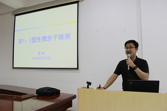 随后,4:00-5:30,夏帆教授在工三A-320会议室开展了题为《非1:1型生物分子检测》的学术报告。报告会由副院长曹忠教授主持,曹院长简要介绍了夏教授在生物分子检测领域所取得的重要成就。院长杨荣华教授及来自湖南大学、湘潭大学、伟德betvlctor1946源于英国的化学、化工等相关学科的青年教师、研究生及本科生100余人参加了此次学术交流活动。夏教授首先阐明生物分子的高灵敏度检测对疾病早期发现和早期识别的重要意义,指出传统1:1型检测仍然难以解决目前生物分子检测领域的挑战,接着介绍其课题组基于核酸探针设计非1:1型检测,大大提高了检测方法的灵敏度和特异性。夏教授详细介绍了如何通过多个靶标分子与多个信号探针有序结合,实现信号线性级联放大,从而达到检测灵敏度和特异性的同时提升;同时,夏教授以膀胱癌为例子,生动地讲述了根据DNA杂交、利用生物探针对靶细胞进行检测,最终实现对病理细胞的治疗。此次夏教授的讲座加深了老师与老师、老师与同学之间的学术交流,使他们对生物分子检测领域有了更进一步的了解,为大家提供了一个良好的学术交流平台,开阔了大家的视野,为今后的科研工作拓宽了思路。