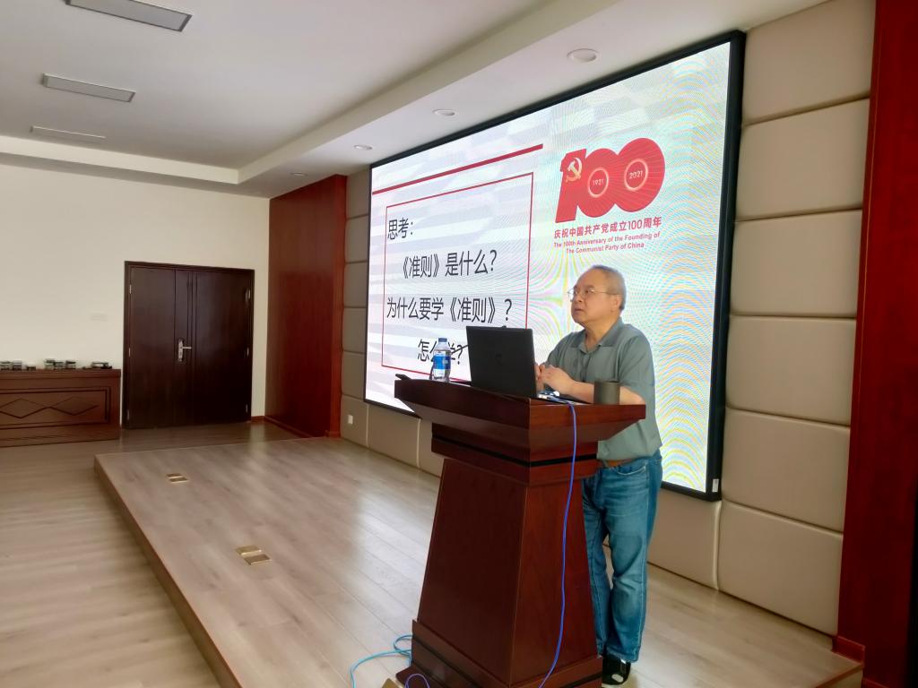 首先,邓豫以“什么是《准则》”、“为什么要学《准则》”、“怎么学《准则》”三个问题引出此次授课内容。接着从时代背景着手,向全体学员介绍了1980年版《党内政治生活的若干准则》和《关于新形势下党内政治生活的若干准则》制定的原因,并指出《新准则》所具备的五大特点。然后结合实际详细讲解了《新准则》中“坚定理想信念”、“坚持党的基本路线”、“坚决维护党中央权威”等十二个具体条款。最后邓豫希望全体学员通过本次党课,能够深入学习党的纪律,加强自我反思,始终做到“心中有党、心中有民、心中有责、心中有戒”,并且希望全体学员以实际行动积极践行《新准则》。
