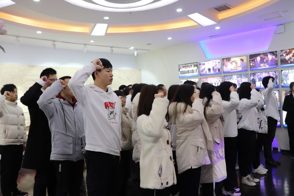 在食品支部李亚鹏同志的领誓下,学院全体新发展党员右手握拳,面向党旗,齐声念出入党誓词,气氛热烈,振奋人心。短短80个字,是怀揣初心站在新起点的他们对党的庄严承诺,是担起使命迎接新挑战的他们为人民服务的强大决心。随后,刘文成同志向新入党的同志表示了衷心的祝贺,并表示希望新发展党员们能进一步端正入党动机,牢记党的宗旨,勇于担当、乐于奉献。站在历史的交汇点上,我们作为学生党员,理应担起时代赋予我们的使命,为祖国宏伟蓝图贡献自己的青春力量。随后,全体新发展党员跟随着讲解员的步伐参观了校史馆,重温了伟德的光辉发展历史,对“博学力行守正拓新”的校训有了更深的理解,坚定了为学校的未来创造更加辉煌的明天的决心。