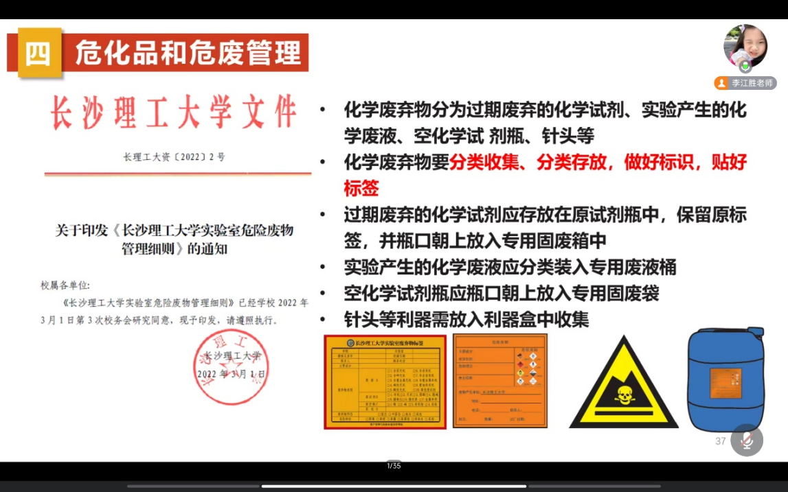 李江胜老师从实验安全的重要性、国家及地区的安全法规、学校安全事故追责条例、危化品和危废条例四个方面展开讲述。通过对实验室安全事故案例进行分析的方法为同学们生动形象的说明了不规范化学实验操作的危害性,强调了实验室安全的重要性。而后就化学实验室操作的注意事项与液体和固体药品的贮存形式等做了详尽的说明。