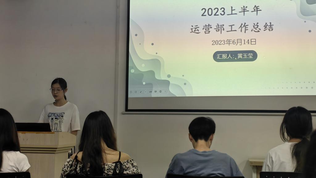 会议开始,由江洁老师发表讲话,对各个部门的工作表达了认可,并对各位部长和各位干事年度的工作表达了真切的赞赏和感谢。紧接着,各部门按照心理部、办公室、媒体部、宣传部和运营部的顺序依次上台作年度工作汇报总结。各部门汇报人就本年度所开展的各项工作进行汇报,并针对工作中所出现的不足作出反思;而后他们围绕在任职期间所学、所想、所悟、所得进行回顾与分享。其中,舍长和副社长针对不同的问题做出了指正与建议,大家都学到了许多。