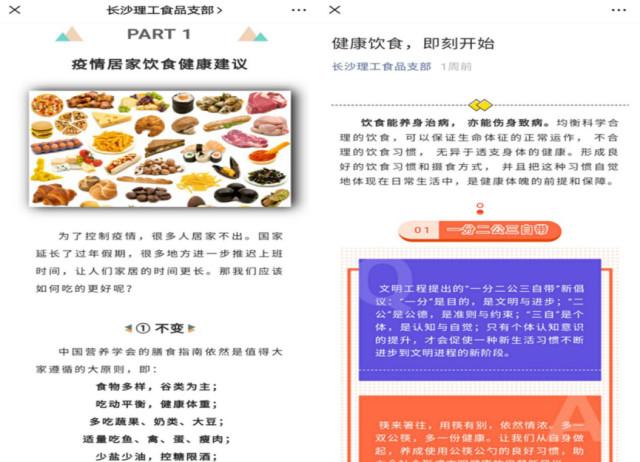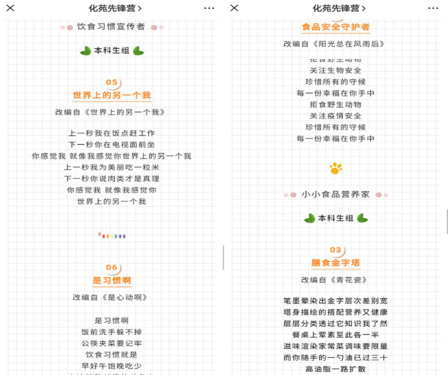支部党员化身食品安全守护者,采取歌词改编、创意画作等形式,引导师生重视食品安全和野生动物保护问题,调整合理膳食结构;支部党员又充当饮食习惯宣传者,采用图案设计、宣传标语、海报图画的形式,倡导“一分二公三自带”“少酒少糖”健康饮食理念,传递健康生活方式。