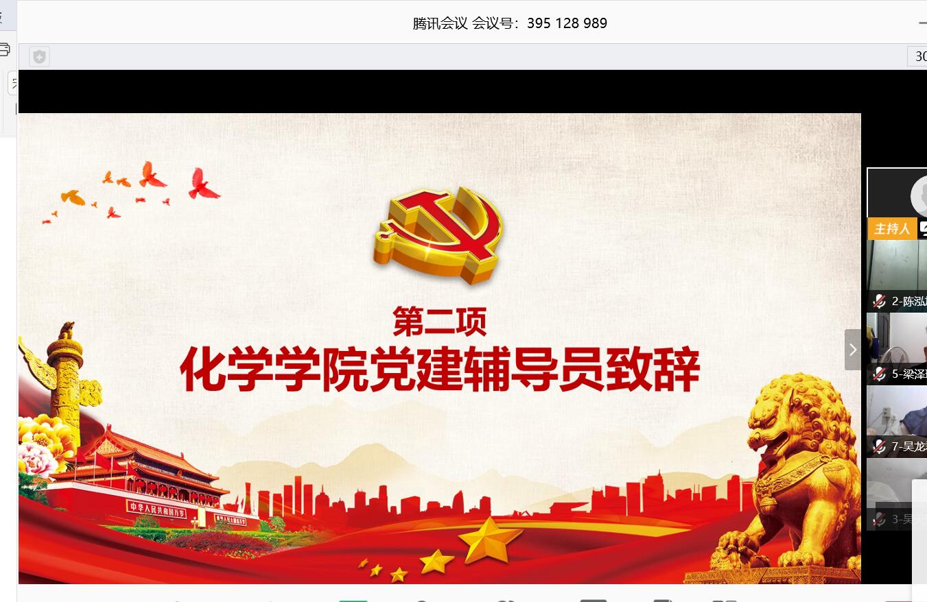 4月20日晚18:00,化学学院、外国语学院通过腾讯会议成功开展第二十一期预备党员培训班开班典礼暨第一次党课,化学学院党建辅导员刘文成以及培训班全体学员出席。