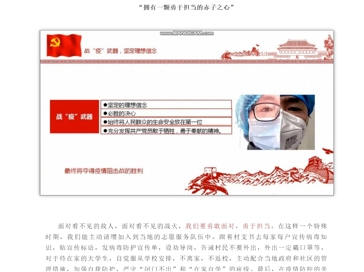 坚定的理想信念是战胜疫情最佳的免疫力。学生党员骨干也积极自备“微党课”,凝聚抗击疫情统一共识。生物支部商艳同志以“战“疫”武器,坚定理想信念”为题进行微党课宣讲,号召广大党员同志坚定必胜信心、主动学习宣传抗“疫”知识,加强专业学习,增强报效祖国的本领。“珍惜这一段居家独处的时光,积蓄力量,增长才干,让我们的专业知识在党和人民需要的时候能够发挥巨大作用”,商艳同志说道。食品支部李亚鹏同志也从习近平总书记重要讲话、党中央疫情防控措施出发宣传解读国家疫情防控政策,深化了同学们对党和国家“始终把人民群众生命安全和身体健康放在第一位”理念的理解,坚定了他们的战“疫”理想信念。