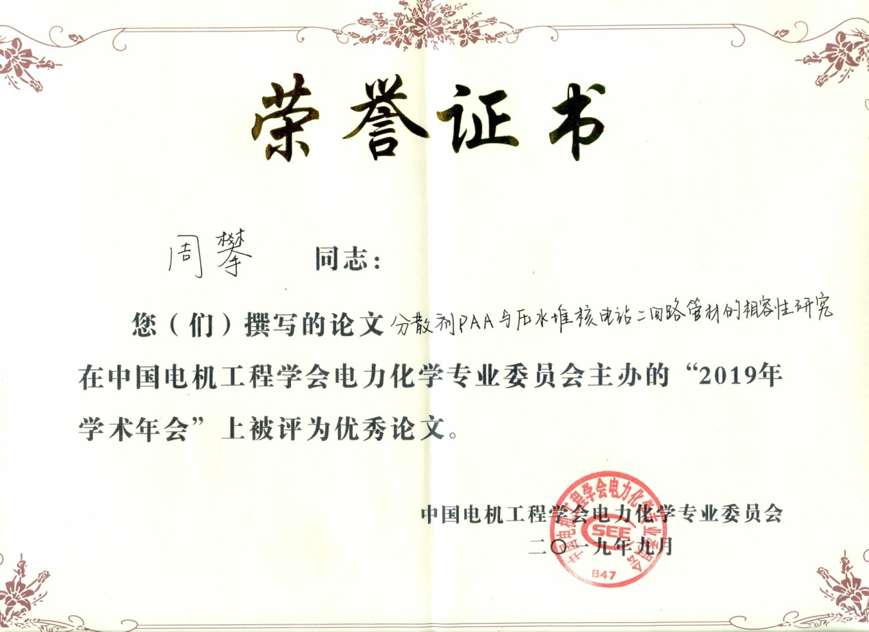 《电力化学2019学术年会》录用141篇,出版论文集1部,我院有10篇论文录用,其中1篇被评选为大会优秀论文,即《分散剂PAA与压水堆核电站二回路管材的相容性研究》(作者:周攀)。