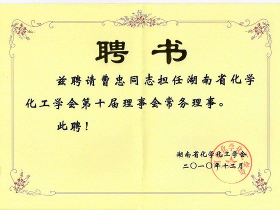 2010年11月27-28日,我院教师曹忠教授、童海霞博士等在湖南大学参加了“2010年湖南省化学化工学会学术年会”和“湖南省化学化工学会第十届会员代表大会”。