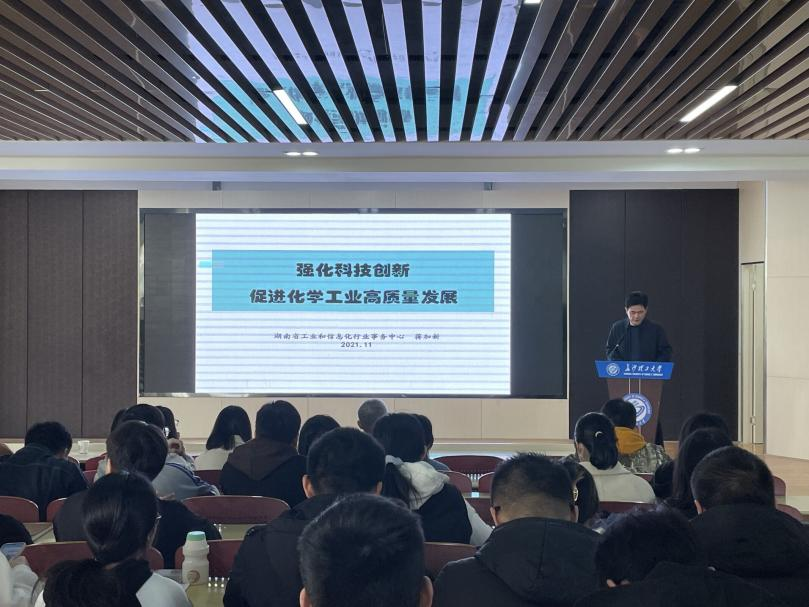 2021年11月25日10:00,应伟德化学化工学院邀请,湖南省工业和信息化行业事务中心副主任、正高级工程师蒋加新来伟德开展学术交流,在云塘校区工三A307做了主题为“强化科技创新,促进化学工业高质量发展”的名师学术讲座。讲座由电力与交通材料保护湖南省重点实验室主任曹忠教授主持,学院副院长张跃飞教授、陈启杰教授、喻林萍副教授,及学院教师和研究生百余人参加了学术讲座。