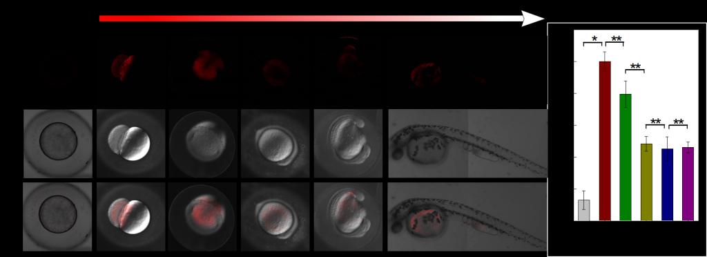 作者基于在荧光探针及激活式载体方面的研究基础,首先设计和合成了H2Sn刺激响应的聚合物胶束载体,通过信号转换设计和信号单元标记,构建了H2Sn刺激响应的荧光纳米信标。纳米信标进入胚胎细胞后,其被内源性H2Sn激活后,释放荧光染料,染料与猝灭剂脱离后荧光信号恢复,实现信号放大且染料可与胞浆蛋白结合,进一步实现荧光信号大幅度增强,从而达到二次信号放大。聚合物纳米信标通过两次信号放大模式展现出极高的灵敏度,从而实现对胚胎发育过程中的H2Sn进行荧光成像。