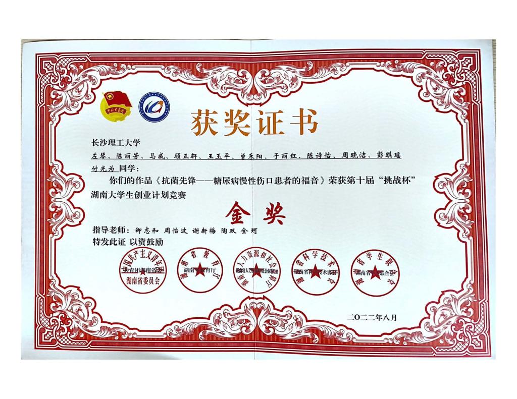 获奖等级:第十届“挑战杯”湖南大学生创业计划竞赛 金奖