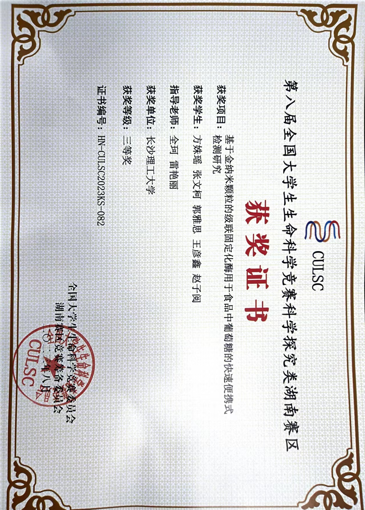 获奖等级:第八届全国大学生生命科学竞赛科学探究类湖南赛区 三等奖