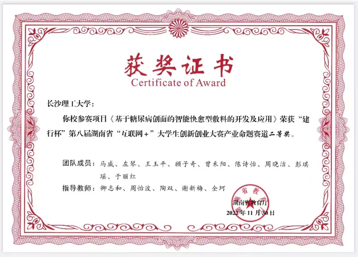 获奖等级:“建行杯”第八届湖南省“互联网+”大学生创新创业大赛产业命题赛道 二等奖