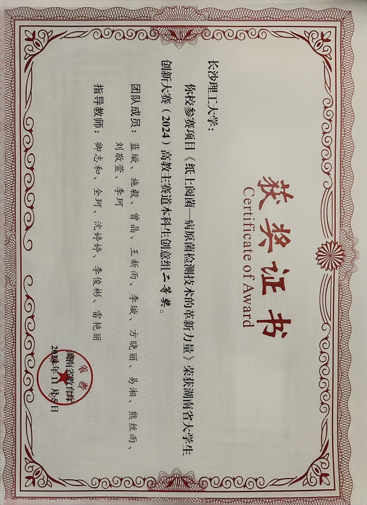 获奖等级:湖南省大学生创新大赛 二等奖