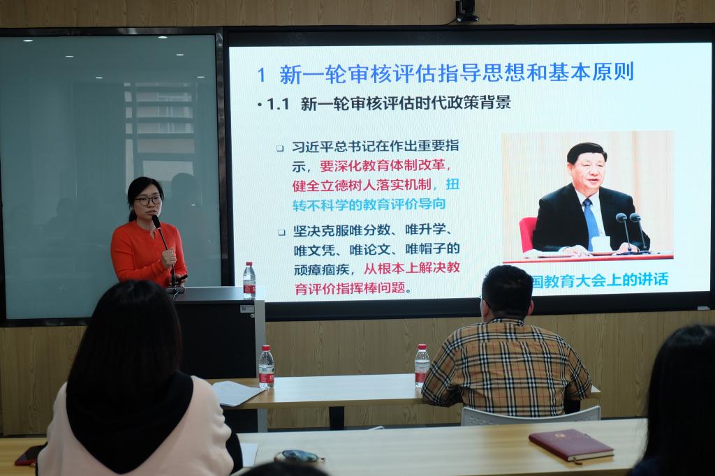 会上,副院长吴悠首先传达学校本科教育教学审核评估教学院工作布置会的会议精神,明确在本轮审核评估中伟德申请参加第二类第一种类型评估,重点以学术型人才培养为主要方向的普通本科高校。接着,院教务办公室主任兼院评估工作小组联络员余志介绍新一轮本科教育教学审核评估时代政策背景、指导思想、基本原则、突出特点和审核评估流程,并对本轮审核评估的指标体系构成及内涵进行解读。随后吴悠从学校审核评估工作方案到学院审核评估工作方案的指标任务对接进行详细阐述,明确学院审核评估指标及审核评估的主要工作内容及任务指标,并对涉及的各部门人员安排、工作任务、进度安排等方面进行布置。