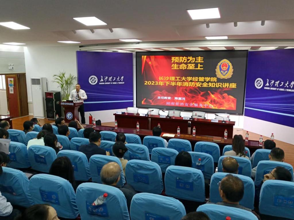 117日下午,经管学院在金盆岭校区12200报告厅召开2023年秋季学期第五次教职工大会,进行消防安全专题教育讲座,主讲人为湖南省普消安全服务中心陈富沅教官,学院党委副书记唐青主持会议