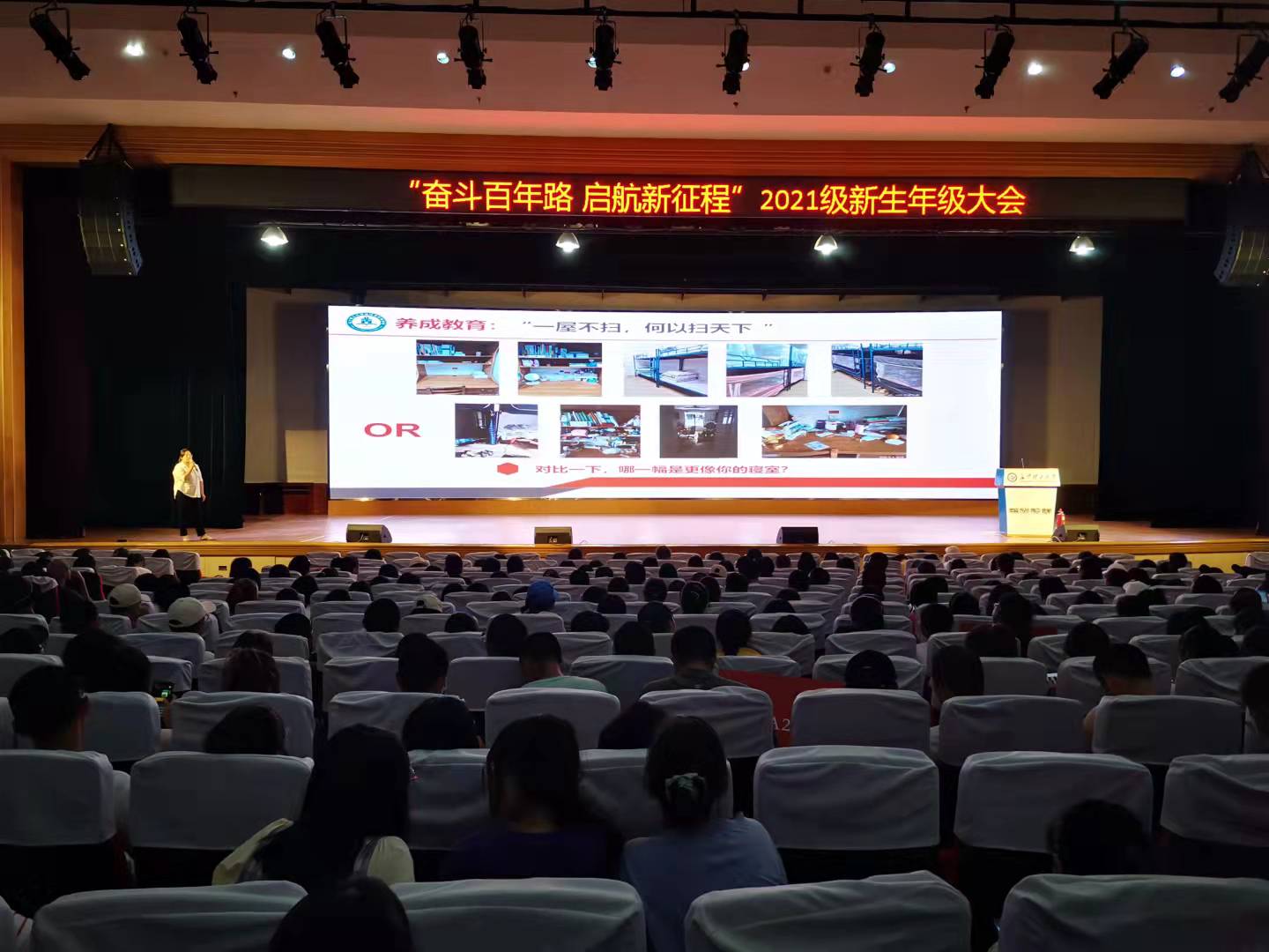 第二环节为“奋斗百年路 启航新征程”2021级新生年级大会。新生辅导员王宝宝首先就新生校内常用办事流程进行了讲解。接着,讲解了《关于进一步加强学生公寓管理秩序的规定》、《伟德betvlctor1946源于英国学生违纪处理办法》的内容,并对学习、生活作息等方面提出要求。最后,结合近期学校电信诈骗案例,提醒新生提高防电诈意识。新生辅导员肖翠,以“做好养成、安全教育规范,打造经管学子品牌”为主题,就养成教育、预防诈骗、安全教育、礼节礼貌、日常行为等方面结合身边事例,对新生提出要求。并号召新生做有志气、骨气、底气的文明大学生。