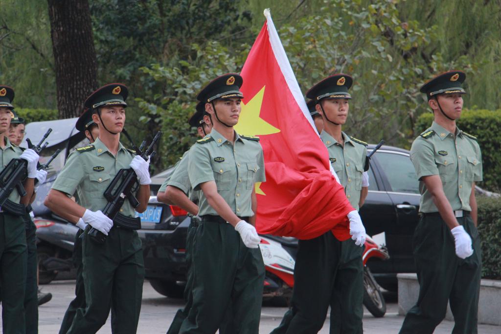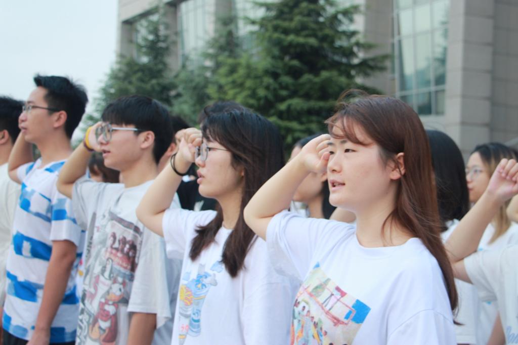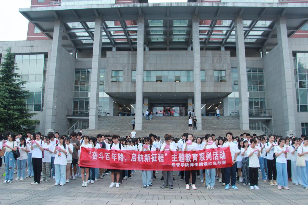 首先进行的是升旗仪式,第一项,民兵连国旗班队员出旗,国旗由民兵连的同学护送入场,整齐铿锵的步伐让全体同学精神一振;第二项,同学们齐唱国歌、行注目礼,嘹亮的歌声激荡着每一位在场同学滚烫的中国心。紧接着,全体学生举起右拳,进行国旗下宣誓的庄严环节。尔后,开展师生朗诵红色故事活动:师生共同诵读方志敏烈士《可爱的中国》节选。在大家深情地朗诵下,同学们对中国当时所处的历史阶段和方志敏烈士对党的忠诚、对革命事业的热忱都有了更深的领悟。最后,唐青鼓励同学们扎实专业学问,增强专业技能回报祖国母亲,并带领大家一起高呼“强国有我,经管Young!”,激起在场每位同学的爱国情与报国志。