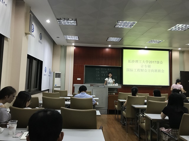 9月25日晚,2017级会计专硕国际工程会计方向班在金盆岭校区7教217室举行新学期班会。财务与会计系主任、国际工程会计方向班负责人王治教授出席了本次班会。