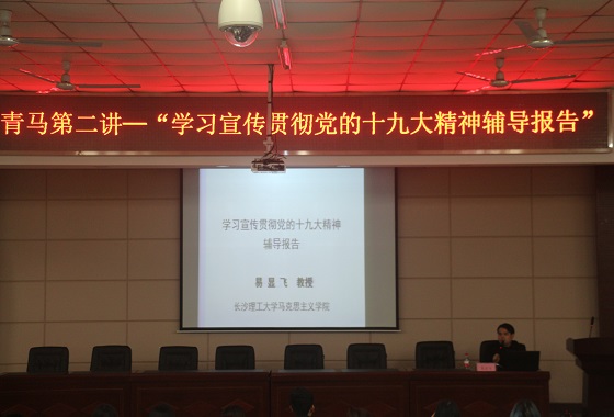 易显飞教授从党的十九大的盛况等八个部分向大家由浅入深的介绍党的十九大。他指出党的十九大的重要性体现在三个部分,一是政治成果,及形成以习近平同志为核心的党中央领导集体,新党纲的修改;二是理论成果,及习近平新时代中国特色社会主义思想;三是为全体人民描绘了新的发展蓝图。并指出在新时代的中国,要做到道路自信、制度自信、理论自信、文化自信。易教授介绍中国在过去5年的工作与历史变革,列举了新中国在近几年在各项领域取得的新发展;讲解了共产党人的初心和使命,新时代中国特色社会主义思想,全国建设社会主义现代化国家新征程的目标等重要内容。
