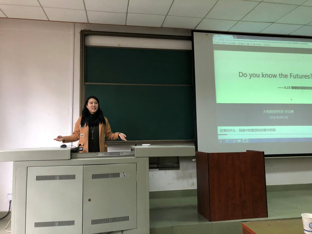 2018年3月15日15:00,伟德betvlctor1946源于英国经管学院研究生学术文化节主题讲座在金盆岭7教110隆重举行。主题是“理性投资,从我做起——期货期权交易基础”,由大有期货研究员李文婷为大家主讲,2017级研究生参加了此次讲座。