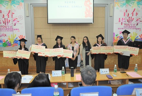 在颁奖环节,经管学院院长陈银娥和中博教育副总裁毛劲梅为全科通过ACCA全球统考科目的五位同学分别颁发了一万元奖学金和获奖证书。中博校友会和经管学院进行了“ACCA优秀毕业生优秀推荐单位”的赠牌仪式。随后,ACCA方向班学生代表熊雅丽及学生家长代表进行了发言。全科通过ACCA全球统考科目的五位同学还向低年级的ACCA学弟学妹赠送了学习笔记。