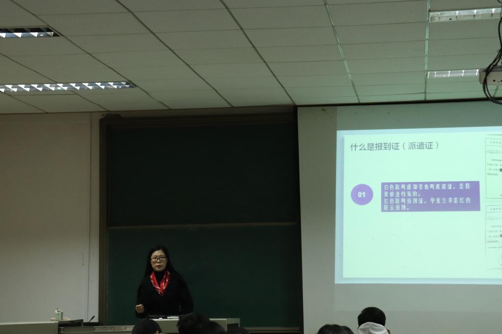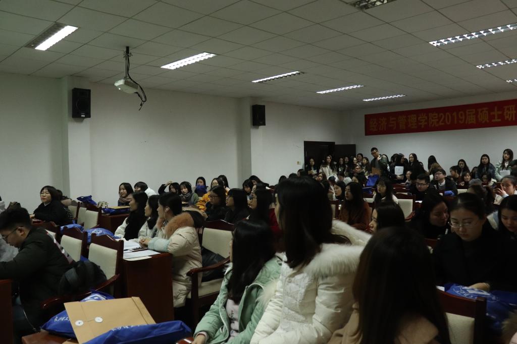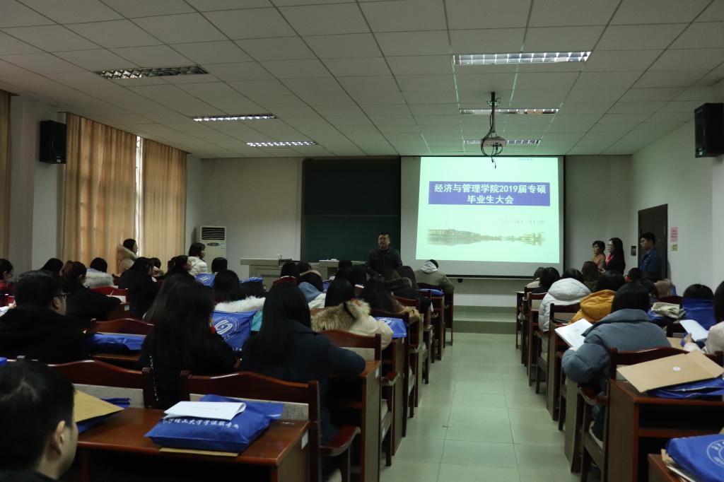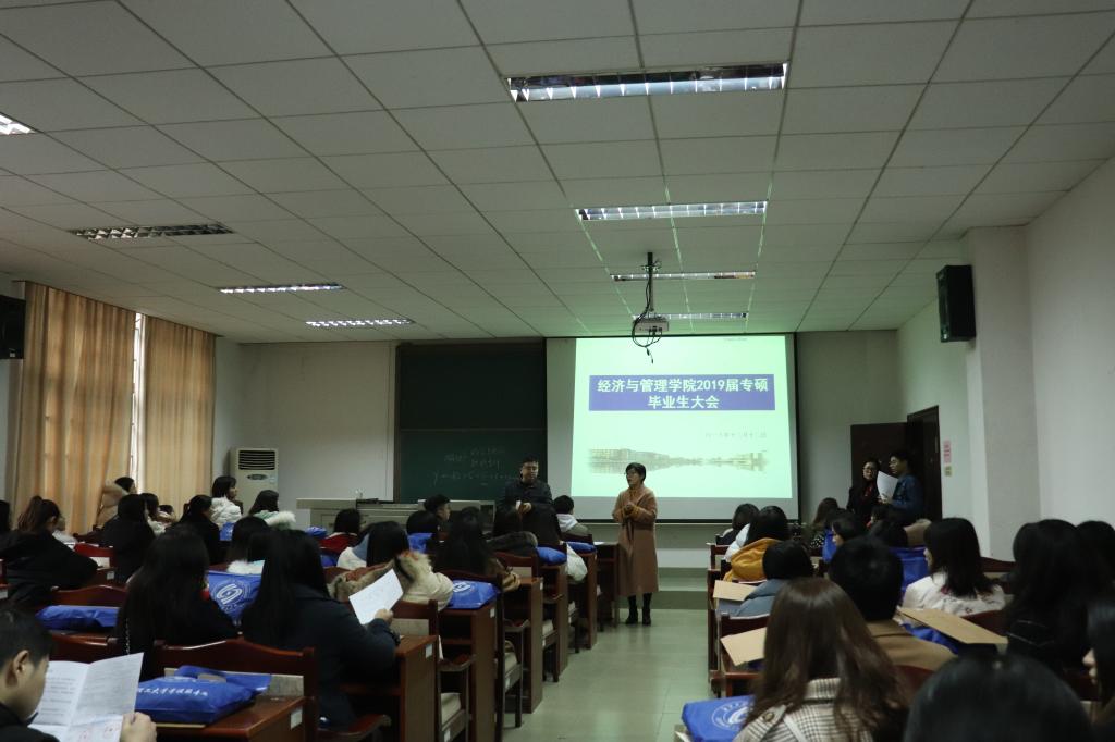 2018年12月12日下午,经管学院在金盆岭校区七教110举行了2019届研究生专硕毕业生大会,会议由辅导员庄奕老师主持,经管学院培养副院长王治,就业辅导员计潇及2019届经管学院全体专硕研究生参加了此次会议。