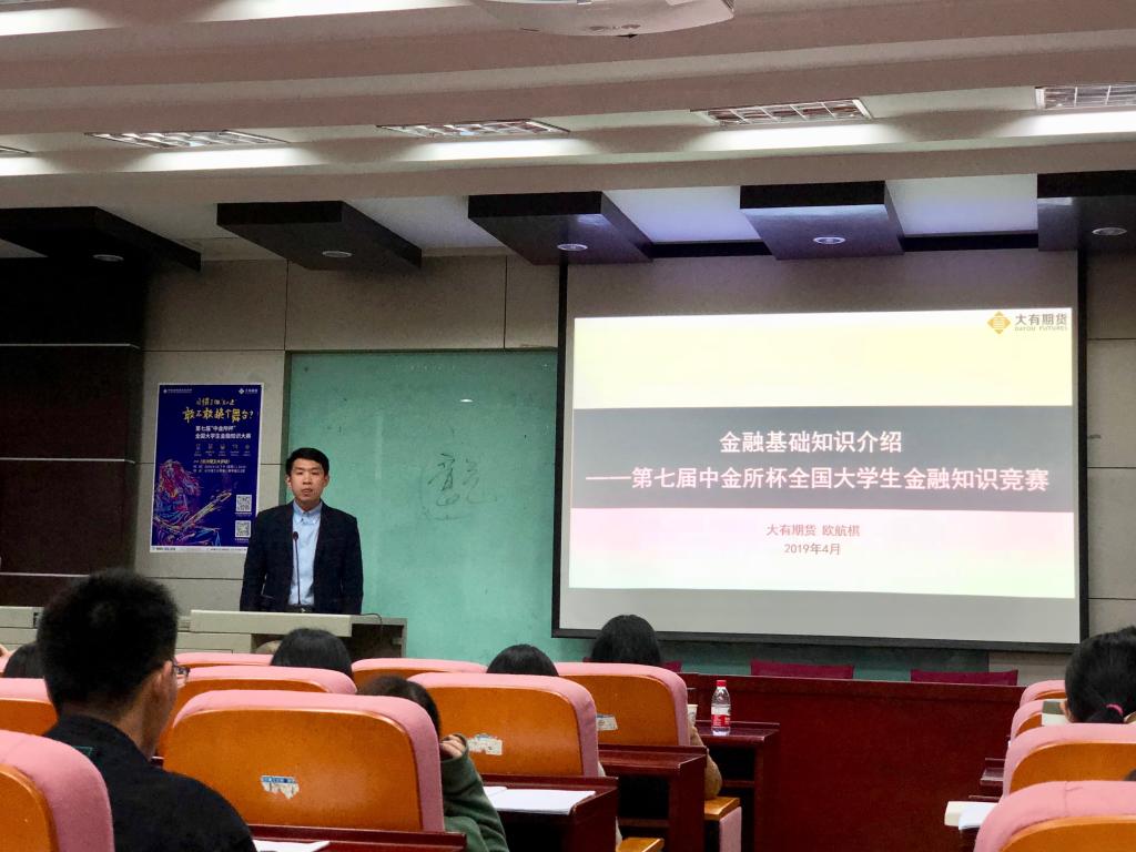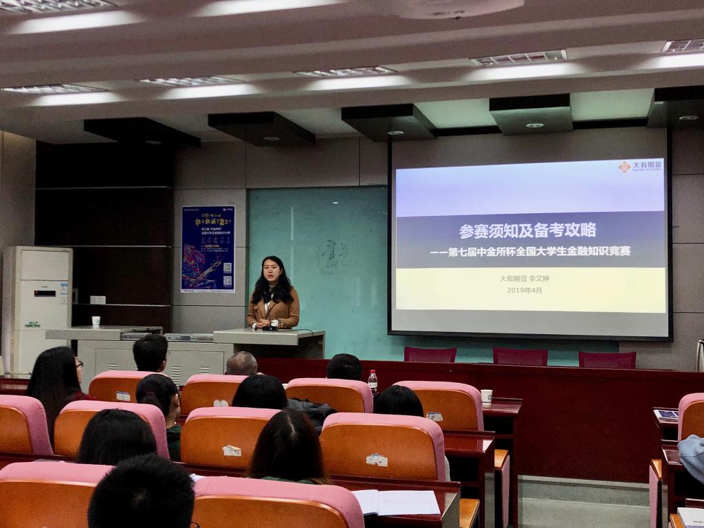 为了让伟德研究生有效地参与第七届中金所杯全国大学生金融知识竞赛,2019年4月10日下午,经管学院在金盆岭校区7教212举行了第七届中金所杯全国大学生金融知识竞赛赛前培训宣讲。本次宣讲邀请了大有期货有限公司投研中心经理助理李文婷和大有期货有限公司投研中心研究员欧航琪担任主讲人,经管学院研究生参会。