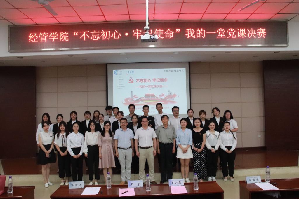 为庆祝中华人民共和国成立70周年,贯彻响应党中央开展“不忘初心、牢记使命”主题教育,经管学院于2019年7月4日晚在文科楼A200举行了“不忘初心、牢记使命”我的一堂党课讲课比赛决赛。担任此次比赛评委的有校关工委常务副主任王乃厚,院党委书记王宏,院党委副书记涂道勇,院辅导员计潇,院辅导员王宝宝。