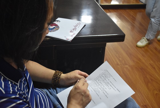 在刘馆长的办公室里挂着这样一幅字:“发上等愿,结中等缘,享下等福;就平处住,向高处立,从宽处行”。通过几日来的相处交流,刘馆长也给大家留下了这样的印象。通过参访文化馆、访谈刘馆长及收集相关资料等,团队成员获得了很多有效信息,也更加明确了接下来对岳州扇的调研方向。