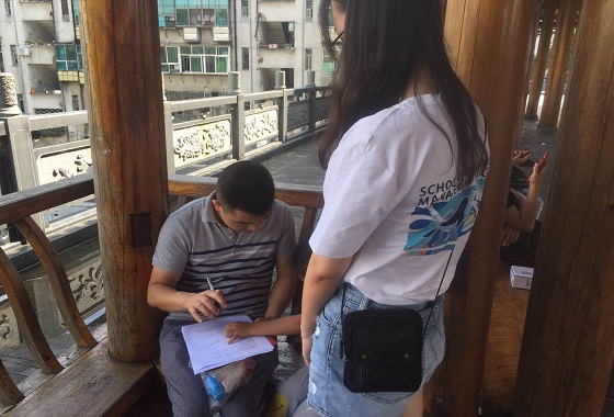 在问卷调查刚开始的时候,调研团成员马子宜在与陌生人搭话,请求填写问卷时有点害羞,进度颇慢,但在其他成员的鼓励下也鼓起勇气迈出了第一步。“我觉得跟陌生人搭话是一件蛮难的事情,”马子宜如是说,“但是风雨桥这边的叔叔阿姨人都很好,成功发出去第一份了就觉得,还挺容易的。”